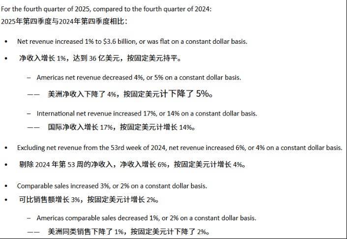 财报显示,剔除第53周及汇率影响,美洲市场2025年第四季度净收入同比持平,其中美国市场下降1%;同店销售额(可比销售额)下降2%。全年来看,美洲市场净收入同比下降约1.02%至78.47亿美元,收入占比从上年的74.9%降至70.7%。