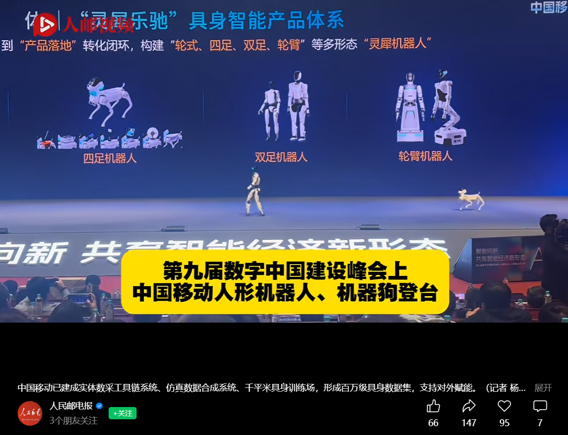 综合每日经济新闻、人民邮电报今日报道,中国移动在峰会上发布了灵犀机器人家族,有人形机器人、机器狗等形态,可提供数据开放、整机销售、服务订阅、标准方案、定制项目、商业租赁等服务;应用场景包括家庭、养老、园区、展厅等。