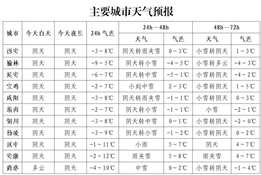 29日: 全省多云转阴天。陕北北部部分地方有小雪,陕北中南部、关中西部及北部、秦巴山区、商洛有中到大雪,关中东部平原、汉中、安康平原有小雨或雨夹雪。秦巴山区局地有冻雨。陕北北部有4级左右偏南风,关中东部4~5级偏东风,阵风6级以上。日平均气温延安南部部分、关中北部部分地方、陕南南部、秦岭山区下降4℃左右。全省大部能见度较低。